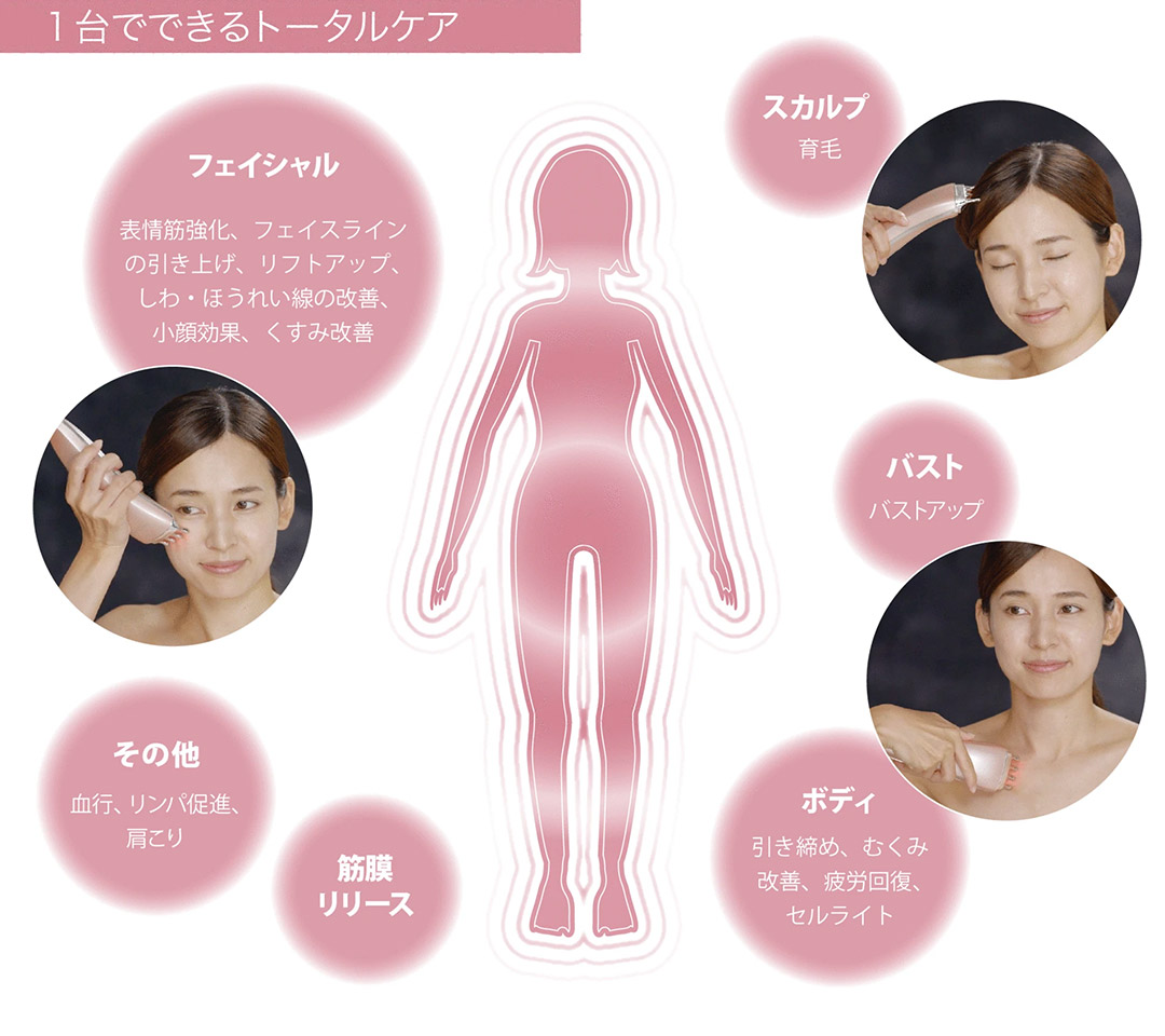ビューティシークレットは、シワやたるみ、薄毛など、年齢と共に増えていくたくさんの悩みを、1台で解決する多機能型の小型美容機器。
